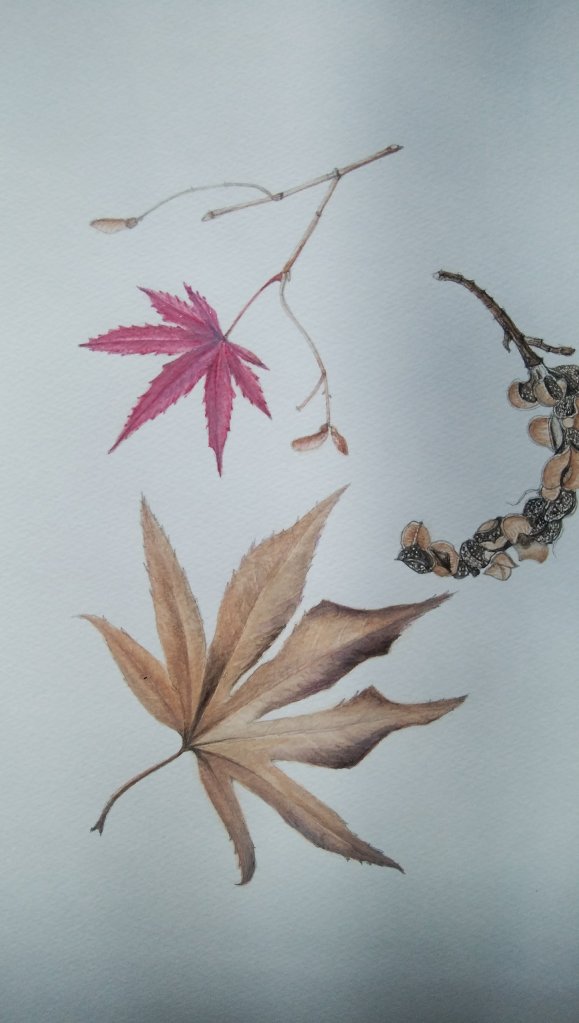 冬の葉っぱを描いてみました。簡単そうに見えてどの個体も難しいです。